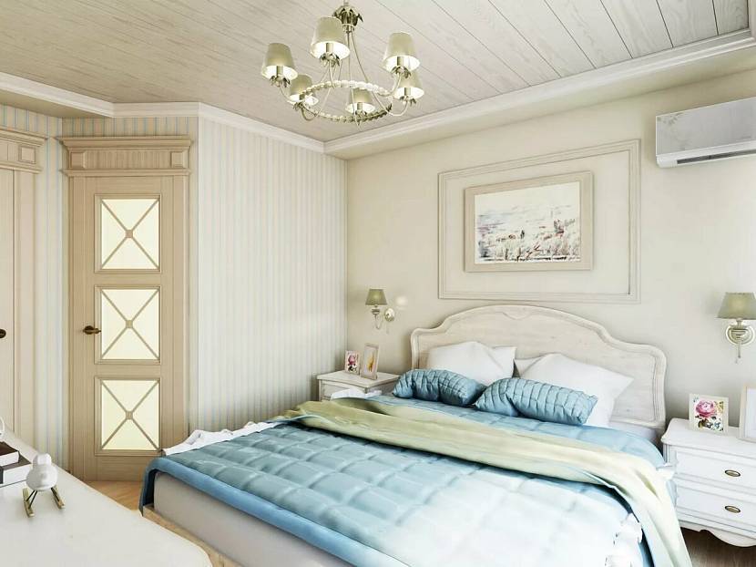 Визуально расширить комнату можно при помощи отделки потолка и стен материалами светлых тонов. Особенно хорошим является вариант, когда потолок делают на несколько градиентов светлее, чем палитра покрытия стен и пола. Это может быть белый матовый потолок и бежевые стены, светлый голубой потолок и оливковые стены, светло-желтый потолок и коралловые стены. Цвет отделки пола может быть любым. Для спален обычно используют нейтральные тона напольной плитки, линолеума или ламината.