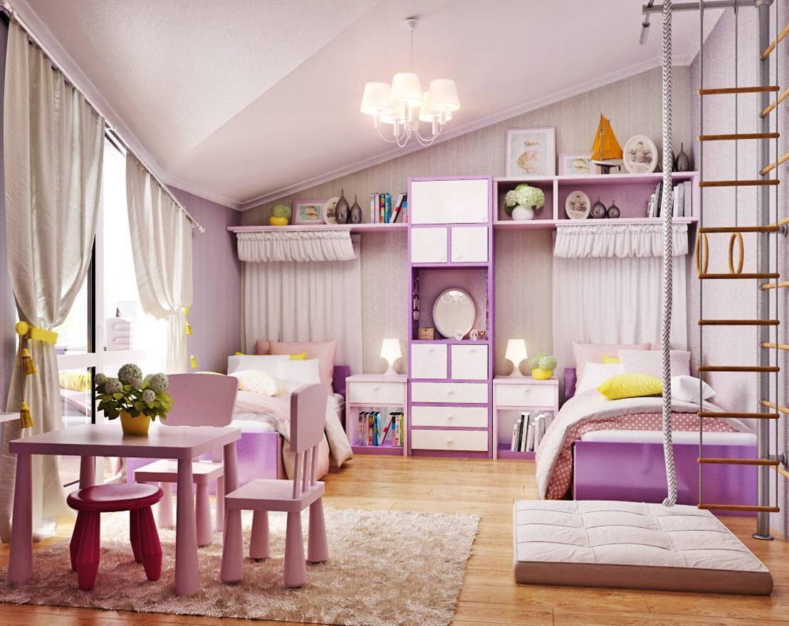 Чтобы учесть желания каждой дочери и обеспечить комфорт для двоих, следует придерживаться принципа зонирования, разделить помещение по функциональному признаку и выделить место для сна, игр и учебы.