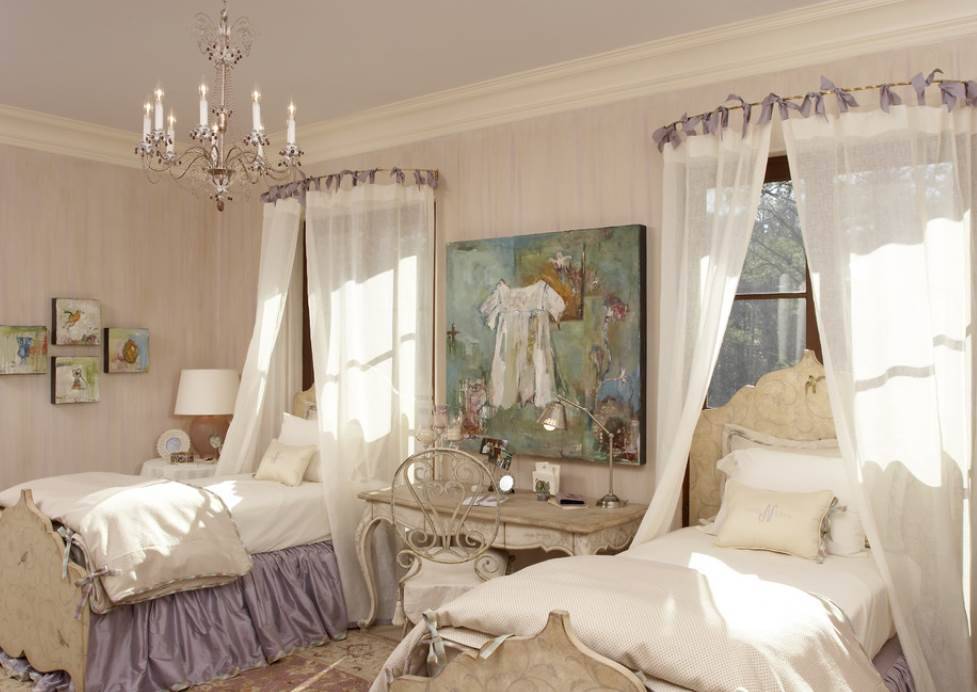 Наилучшим вариантом станут стоящие отдельно кровати, а также все предметы интерьера, приобретенные в двух экземплярах для каждой из дочерей. Детская комната для двух девочек обязательно должна быть с зеркалами, одно из которых должно быть в полный рост.