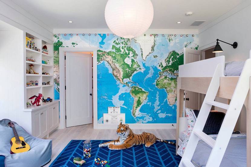 Разграничить детскую для двух мальчиков можно и при помощи цвета – окрасить стены в разные тона или использовать обои с принтом и без него. Интересная идея — возведение пьедестала. Сверху располагают учебную зону, а кровати делают выдвижными.