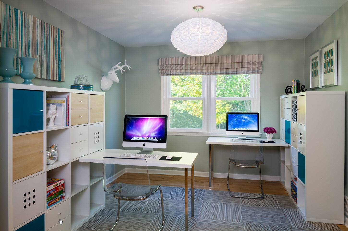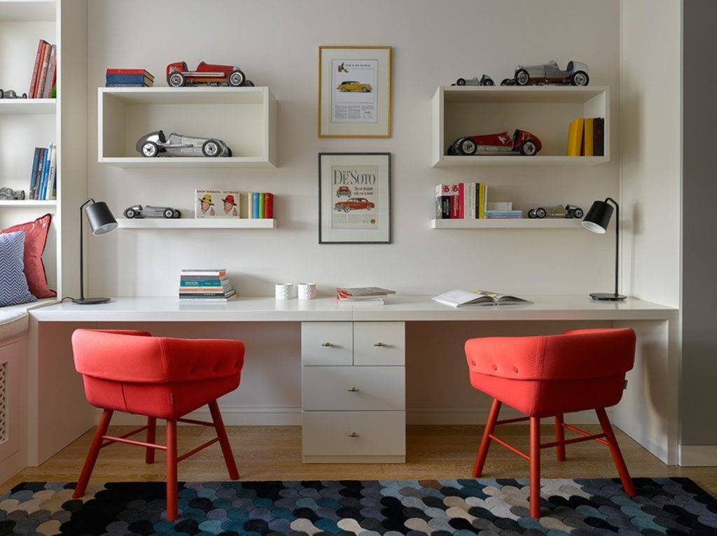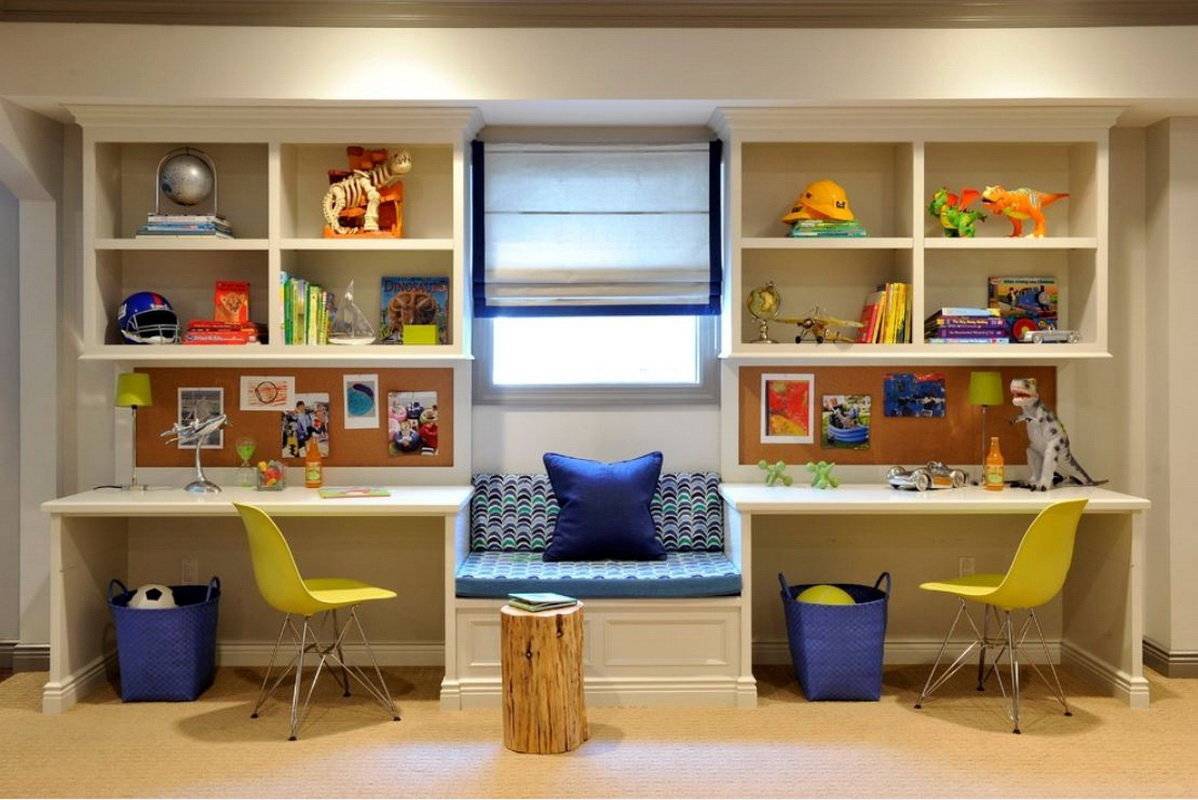 Уголок для выполнения домашних заданий оформляется в приглушенных тонах, чтобы ребенок не отвлекался от учебы. Обоих детей необходимо обеспечить своим рабочим местом и стульями. Когда длинным письменным столом выступает переоборудованный подоконник, он просто делится на две части.
