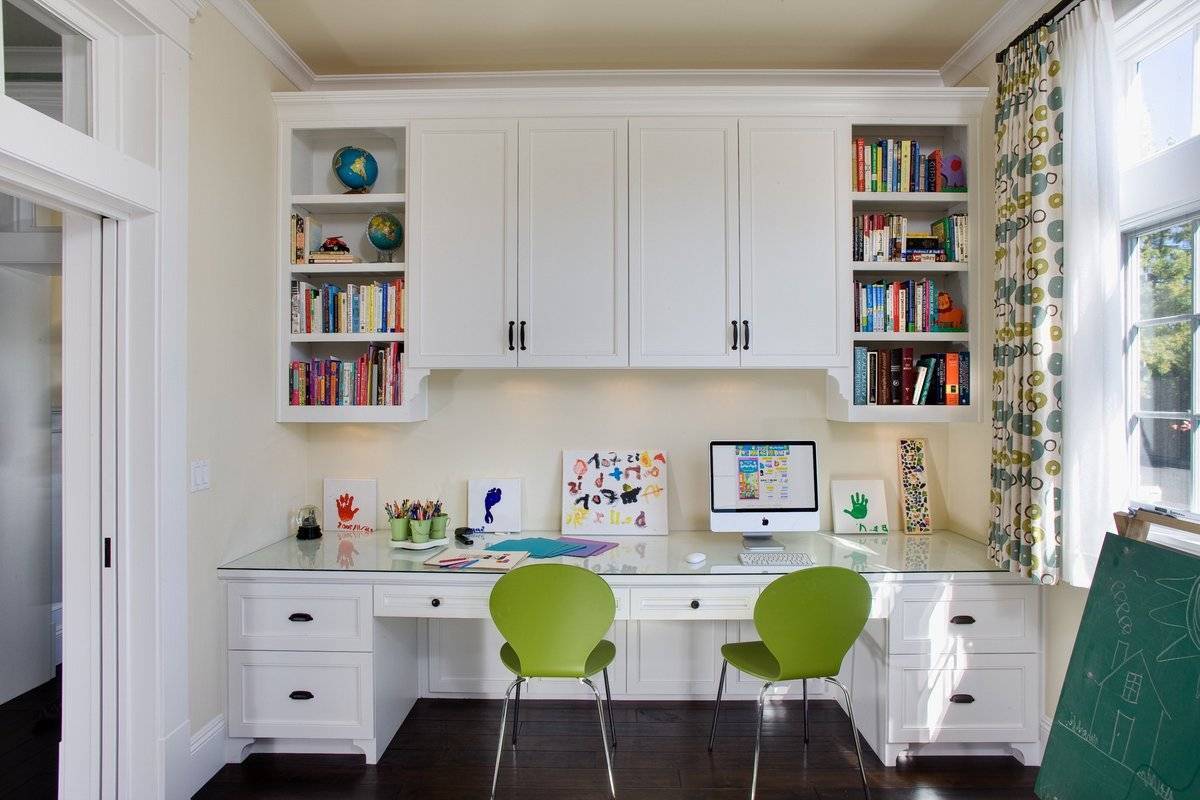 В качестве рабочей поверхности можно использовать одну большую столешницу. совмещенную с подоконником. Просто для каждого их ребят предусматривается стул и места для хранения учебных материалов. Не забудьте подумать о качественном освещении рабочей поверхности для в темного времени суток .