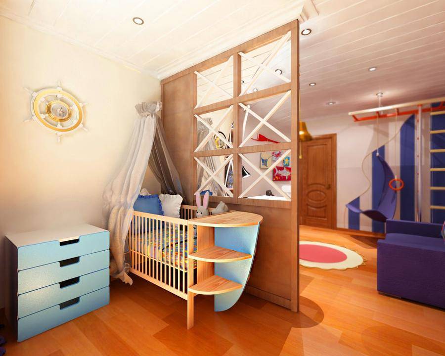 Конечно, чаще всего, только что появившегося малыша родители предпочитают поселить рядом с собой в одной комнате. Но возможен и такой вариант, когда в родительской спальне абсолютно нет места для колыбели крохи. В этом случае кроватку для новорожденного ставят в общей спальне с подросшим малышом. Возможно, придется отказаться от какого-либо предмета мебели (например, комода). Ставить двухъярусную кровать еще рано, так как в ней не предусмотрены бортики, и маленький может упасть на пол. Поэтому придется рассмотреть вариант с полноценным спальным местом для старшего ребенка и кроваткой-колыбелью для новорожденного.