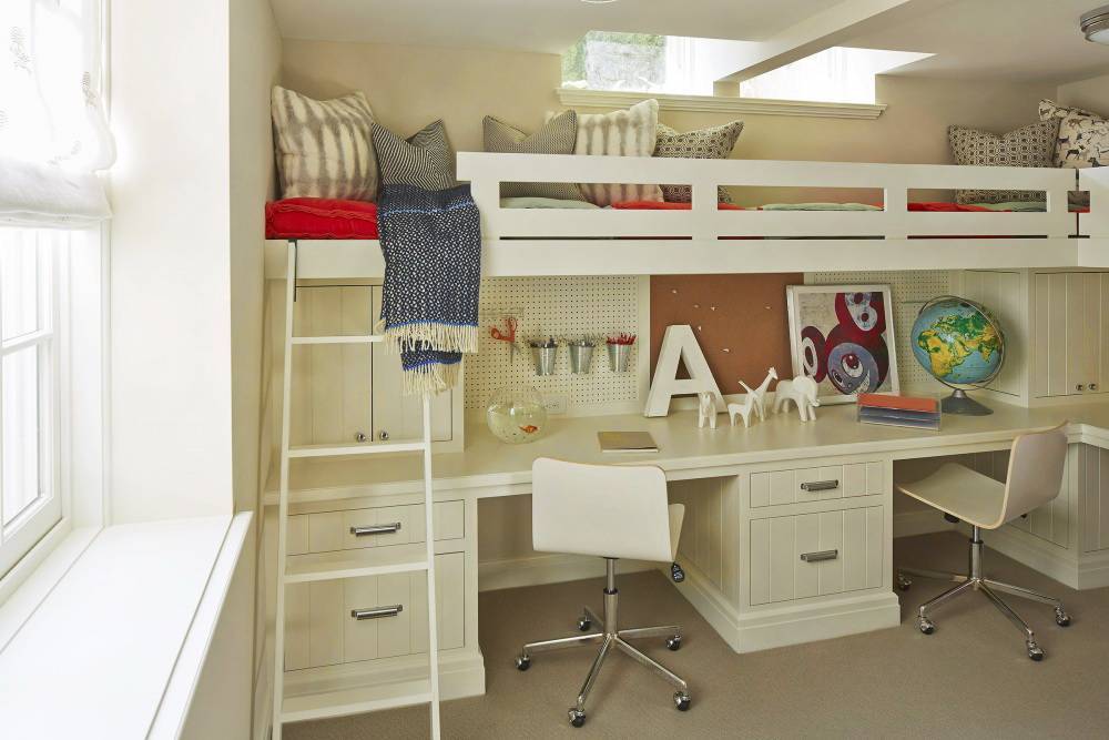 Если площадь комнаты позволяет, то вы можете расставить односпальные кровати, кушетки или диванчики Г- или П-образно (на фото ниже), параллельно друг другу, в один ряд или в два. Этот вариант хорош не только из-за удобства и безопасности, но и с точки зрения обеспечения дополнительных мест хранения. Ведь у каждой постели вы сможете поставить тумбочку, повесить полку или организовать «склад» вещей под матрасами.