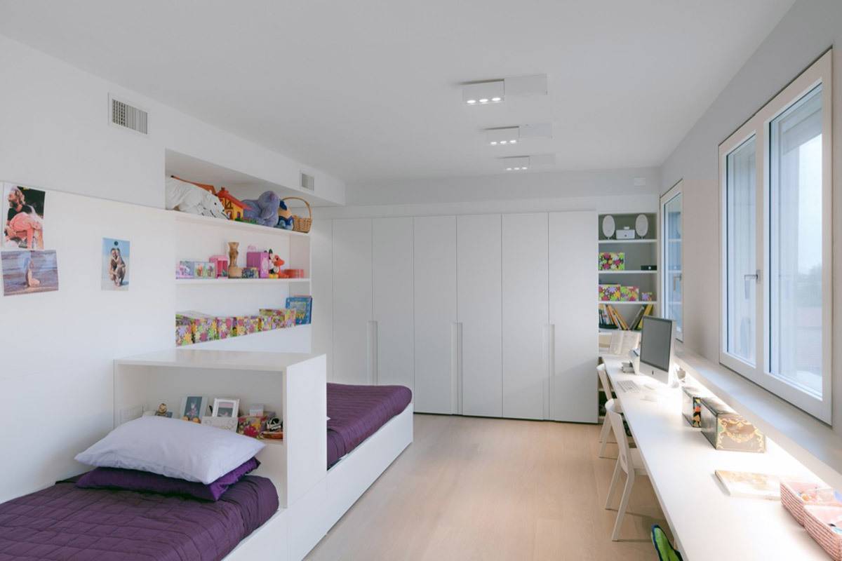 В дизайн детской комнаты 12 обязательно включают зонирование. Маленькую спальню можно разделить при помощи выдвижной софы, служащей спальным местом. В изголовье обустроить навесные шкафы, выдвижные или стационарные полки, а также боковую мини-перегородку. В углу у окна письменный стол. Напротив него – шкаф для вещей.