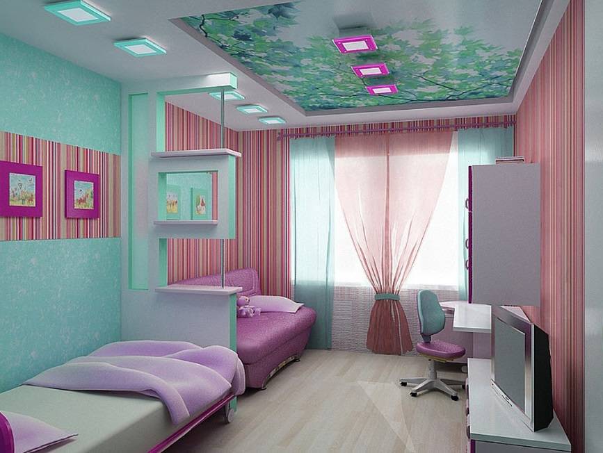 Для мальчиков постарше подойдёт 2-ярусная кровать, для девочек – размещение двух кроватей вдоль одной или двух стен. Напротив зоны сна можно расположить зону для учёбы и занятий – письменный и компьютерный стол, шкаф для книг.