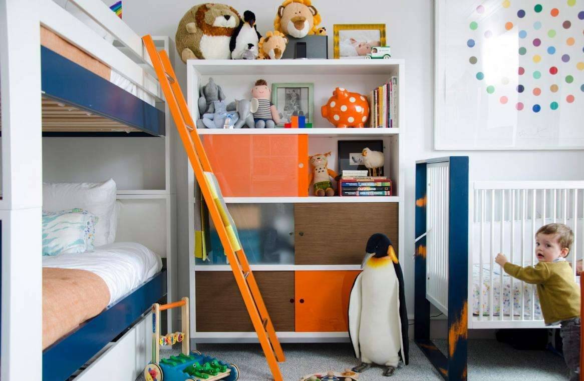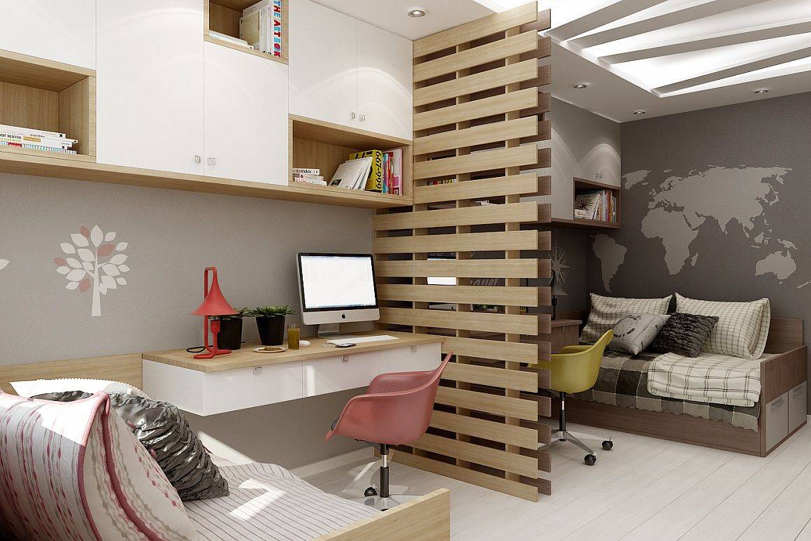 Если же один ребенок еще совсем малыш, а другой уже школьник, разумнее всего будет наоборот, разделить игровую и учебную зону с помощью шкафов или искусственных стен для того, чтобы младший не мешал старшему.