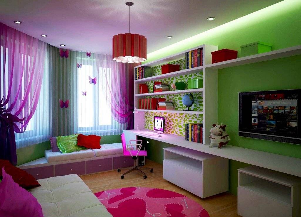 Если площадь большая, то можно выделить территорию дочки и сына. Для первых в основном используют синие, голубые и зеленые цвета, а вторых – розовые и красные.