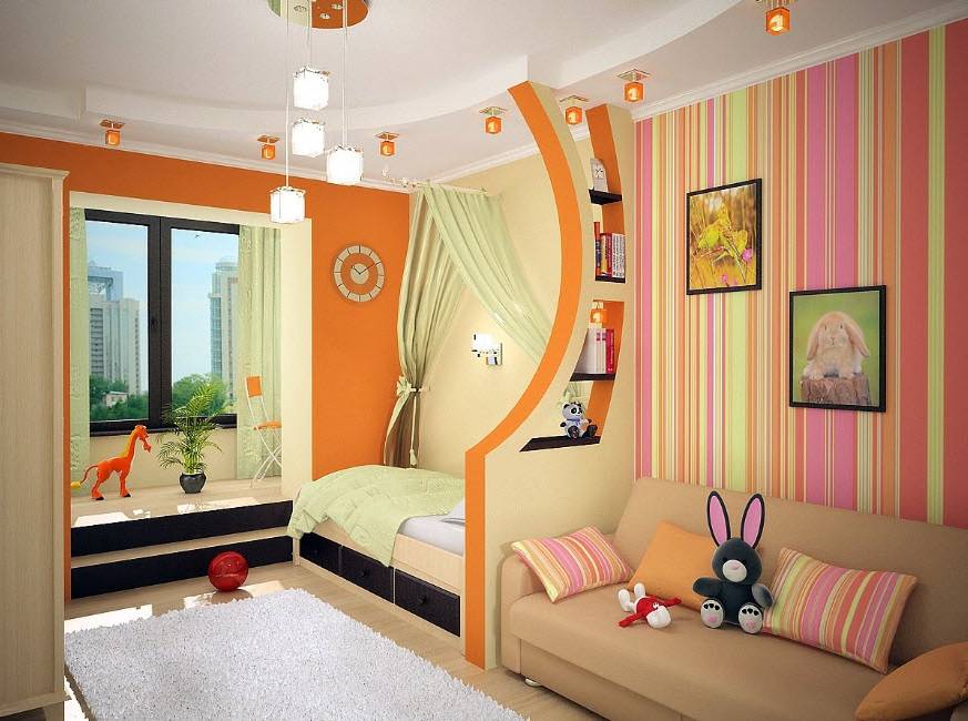 Достаточно неординарно выглядят в детской многоуровневые конструкции. Зачастую одну часть комнаты приподнимают над уровнем пола на небольшой подиум. Возможны различные варианты зонирования пространства с помощью разной высоты.
