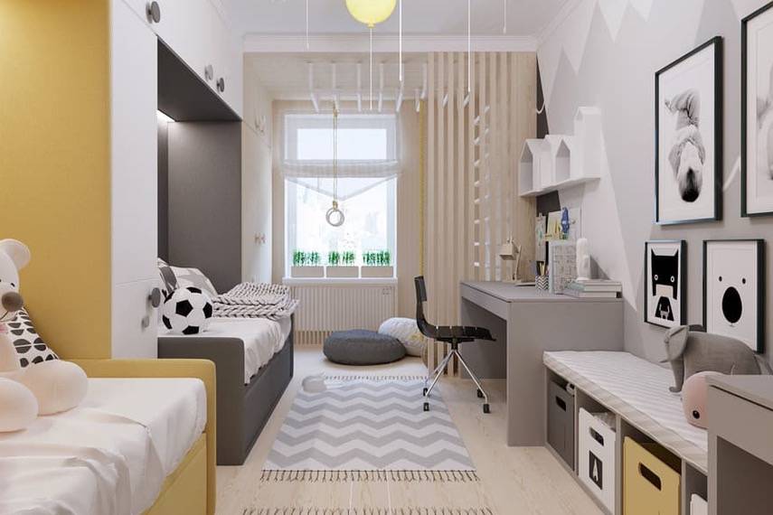 Разделите комнату на зоны в интерьере детской комнаты для разнополых детей