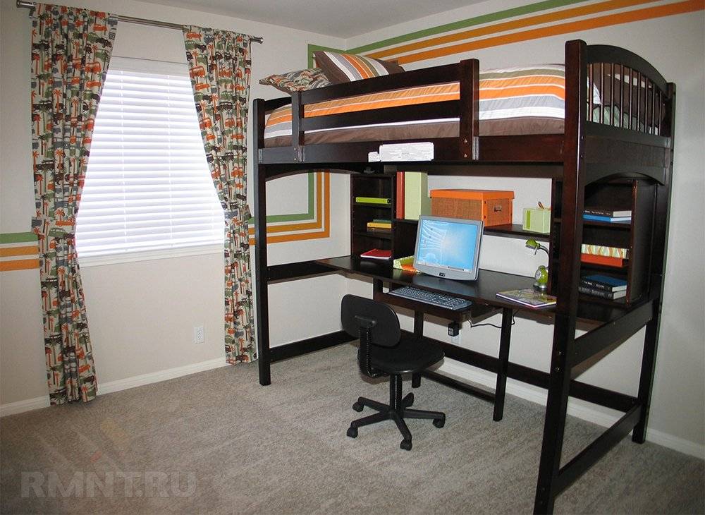 Если от пола до кровати сохраняется достаточная высота, рекомендуется оставить часть пространства под столешницу. Для учёбы и работы этот вариант подходит оптимально: ширина односпальной кровати составляет около 80–100 см, такая же глубина оптимальна для просторного стола.