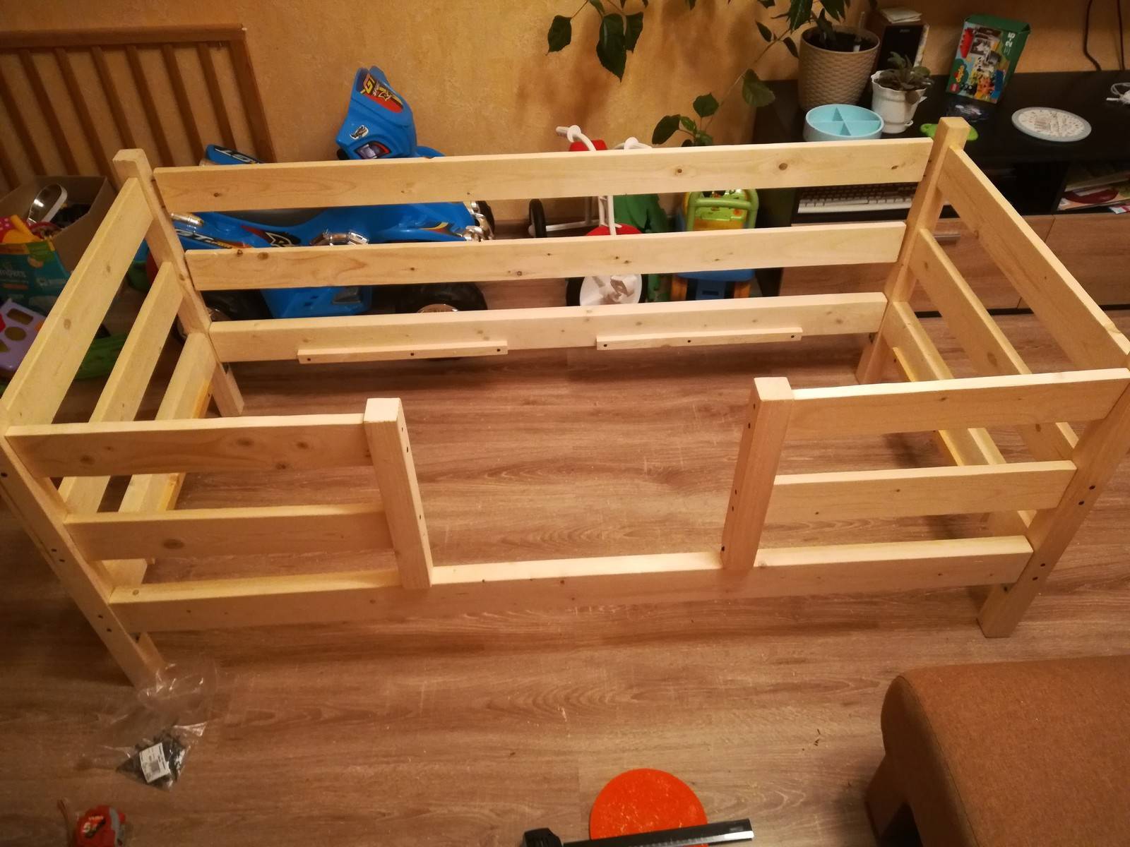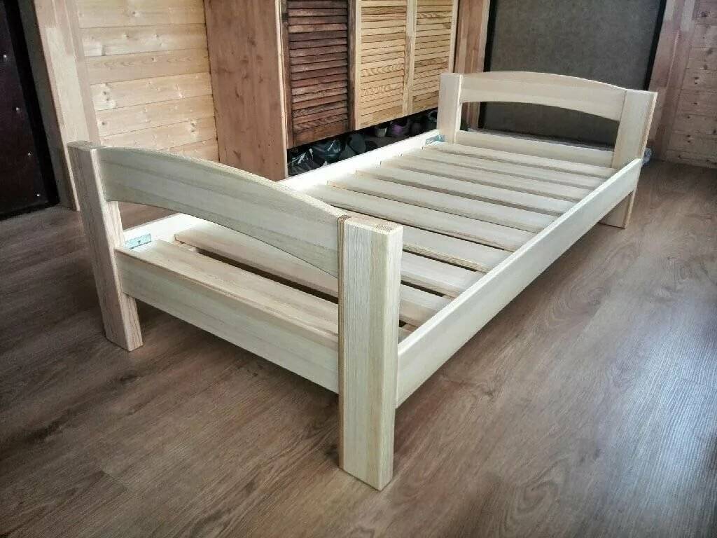 Рассмотрим подробно сборку в домашних условиях простого односпального одноярусного спального места для ребенка из дерева. Для этого понадобятся доски, брус, рейки, саморезы и болты.