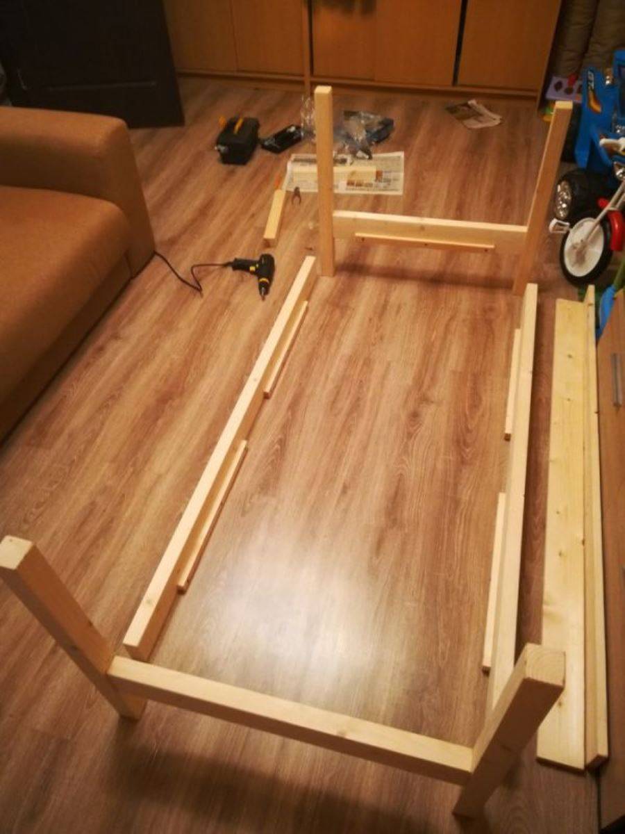 Сборка кровати включает в себя соединение всех составных элементов при помощи болтов и саморезов. Тщательно следите за тем, чтобы каждый из элементов должен быть обработан при помощи наждачки.