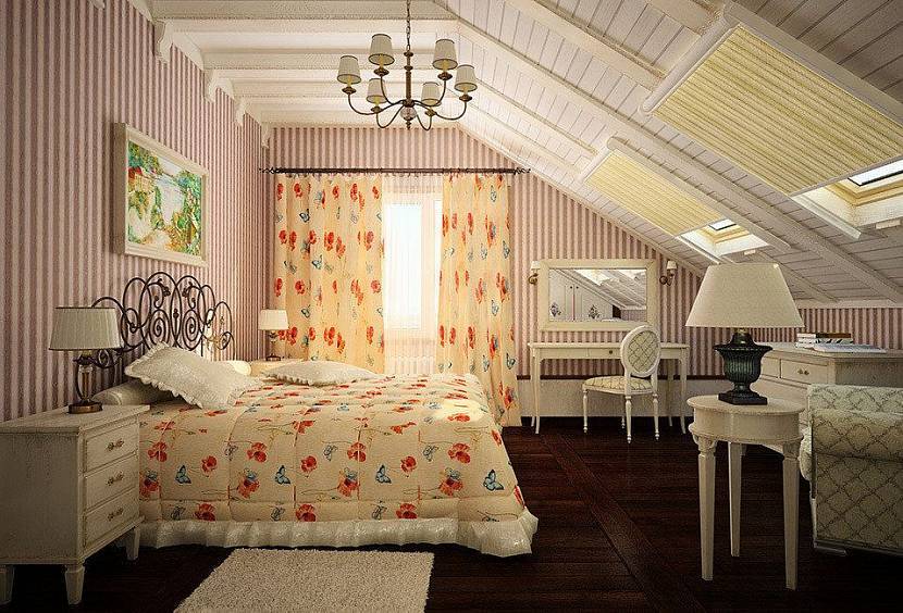 Деревенские стили. К ним относится русский стиль, кантри и прованс. Популярность этих стилей объясняется той атмосферой уюта, которую они способны создать. Если вы остановитесь на одном из этих направлений, то маскировать потолочные балки уже не придется — они гармонично впишутся в дизайн спальни. В оформлении используется удобная и практичная мебель, большое количество текстиля, разнообразный милый сердцу декор. Цветовая палитра основана на использовании природных оттенков — коричневых, зеленых, бежевых; охотно используются геометрические и растительные орнаменты. Спальня на мансарде в стиле прованс считается самым востребованным вариантом. Пол в таком помещении исключительно деревянный, стены оклеиваются изящными узорчатыми обоями или небрежно штукатурятся, в палитру добавляются яркие акценты лаванды и бирюзы.
