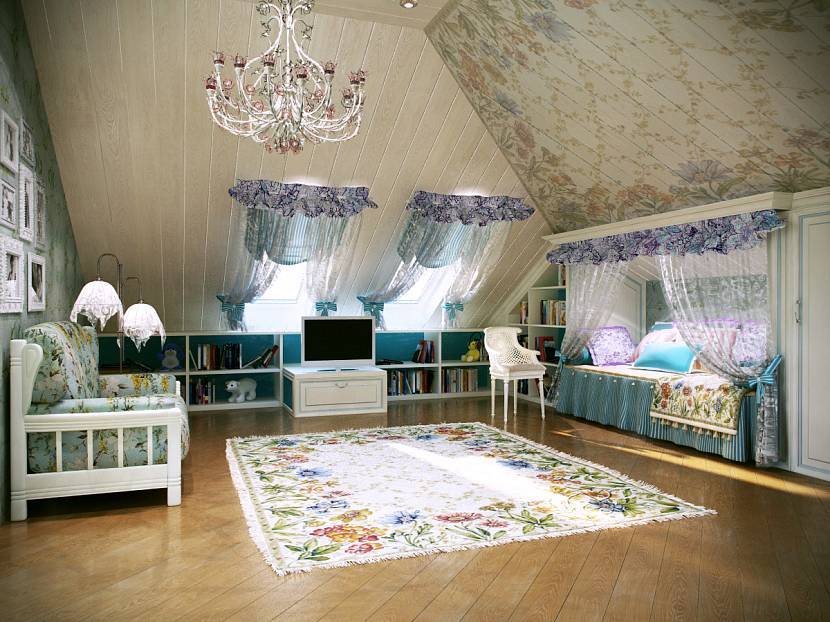 Чердак прекрасно подойдет для создания уютного уголка принцессы. Оптимальным выбором для девочек, старше 7 лет становится , в котором найдется место для кровати, хранения одежды, книг и любимых мелочей. В качестве ярких акцентов могут быть использованы шторы с тематическим рисунком, деревянный пол, или покрывало с оригинальным орнаментом.