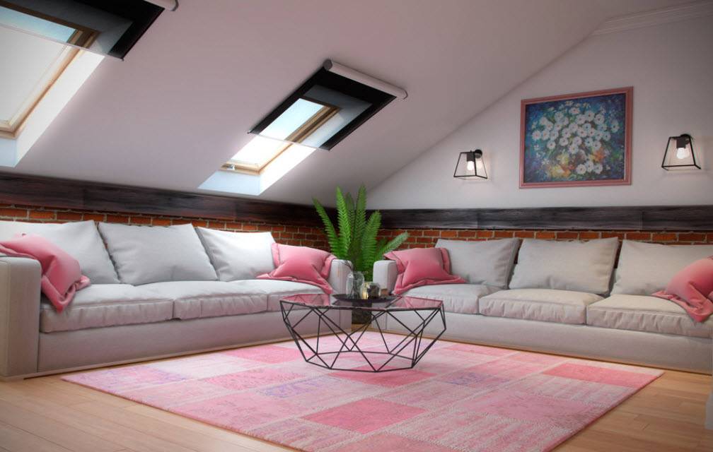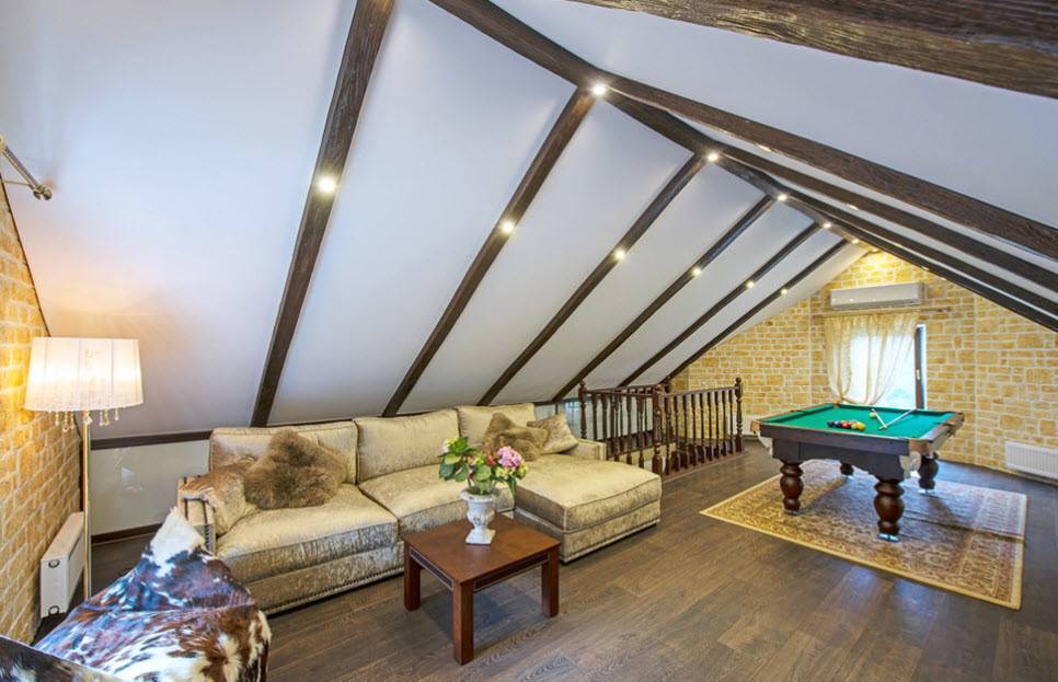 - Крыша сложной формы или ломаной конфигурации усложняет задачу. Опытные дизайнеры рекомендую каждую часть обособленного пространства наполнять соответственно разному функционалу или по принципу зонирования, как на фото.
