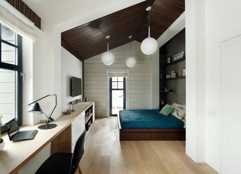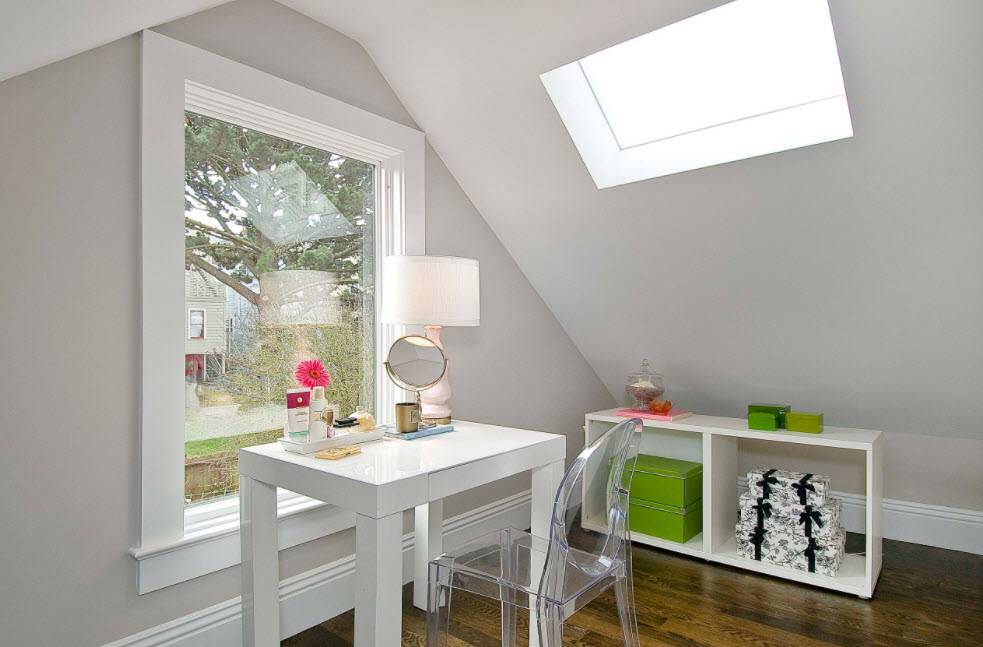 Зоны с заниженным потолком можно приспособить под камеры хранения, а на фронтонных отсеках — разместить подвесную мебель. В идеале – оборудуйте свое рабочее место около окна, тогда и света вам будет хватать, и вид из окна будет повышать настроение.