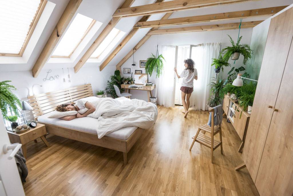 Отделка стен и потолка мансарды деревом позволяет сделать спальню уютной, натуральной и экологичной