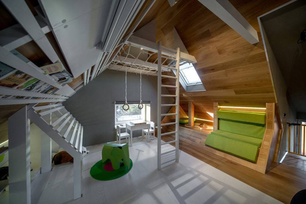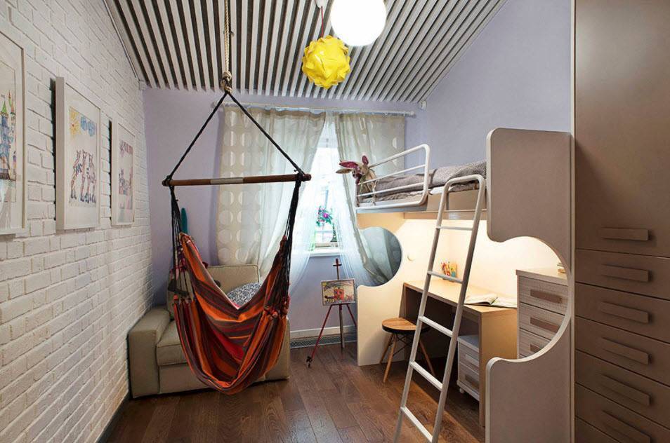 Игровая зона, в этом случае, вмещает небольшие шкафчики для игрушек и мелочей. Мебель, расположенная в труднодоступном для других идей месте, в сочетании с подвесными креслами, освобождает пространство. При таком оформлении актуальными станут встроенные кровати и другие устройства. Наличие деревянной отделки поверхностей, больших окон и эффектных акцентов, преобразуются в сказочное царство, в котором найдется место не только для сна, но и увлекательным приключениям.