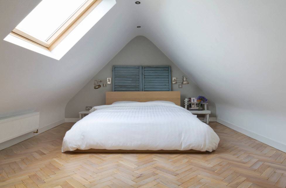 Скошенная спальня может нагреваться более интенсивно, чем комнаты на первом этаже, поэтому стоит использовать внешние жалюзи — современные модели доступны на пульте дистанционного управления, что облегчает управление затвором. Также выберите внутренние жалюзи — они послужат украшением комнаты.
