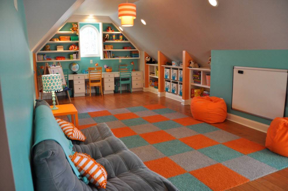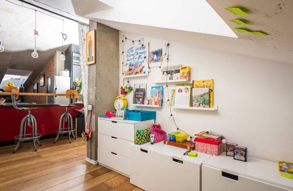 Больше всего любят такие высокие, нестандартные помещения дети, поэтому, зачастую, именно в их владение и отдается эта территория. Проектов детской комнаты на мансарде достаточно много, хоть стены и не очень высоки, зато площадь большая, так что поместится и кровать, даже не одна, и место для игр, и рабочий уголок с письменным столом и компьютером. Найдется также место для спортивных снарядов, телескопа, шалаша или игрушечного дома и прочих детских радостей.