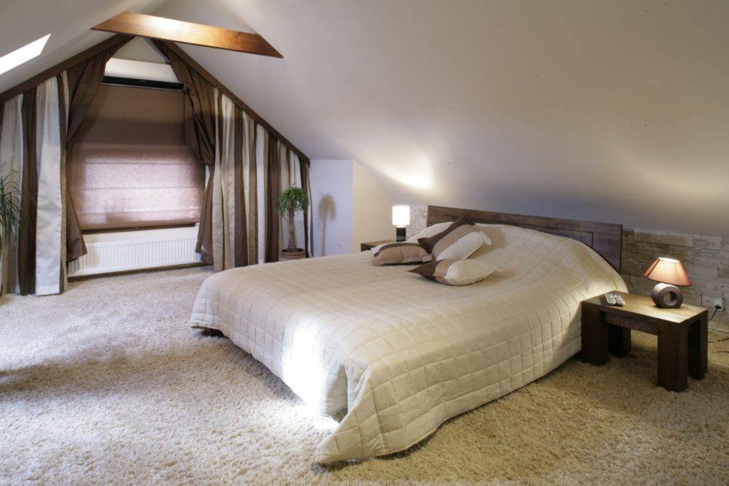 Обустройство интерьера «хозяйской» спальни в мансарде по фото целесообразно только при наличии достаточного пространства. Такой прием поможет получить тихую и уютную комнату для сна и более рационально использовать нижние комнаты.