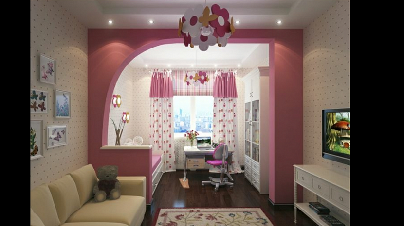 Если в детской будет жить девочка, там должна быть обязательно мягкая мебель и текстиль в нежных розовых тонах. Для создания гармоничной отделки стоит их продублировать и при оформлении взрослой гостиной.