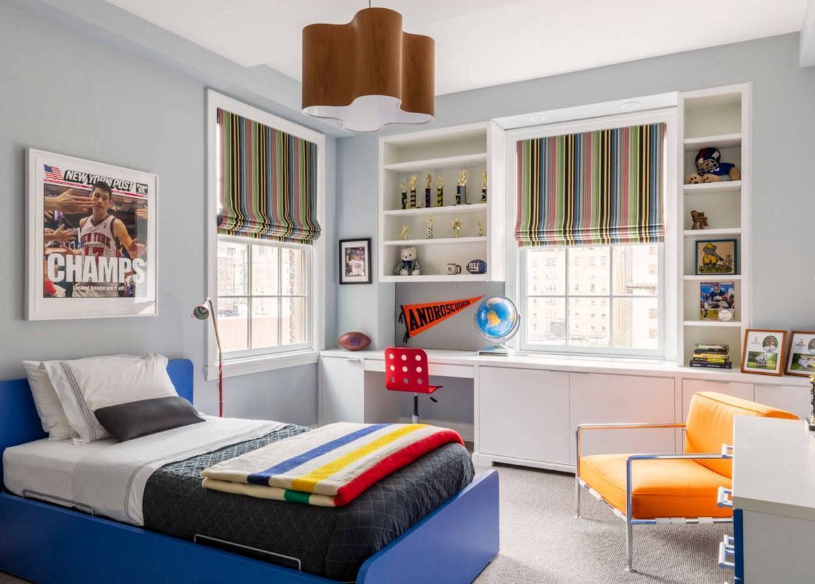 Детскую часть комнаты для мальчика лучше выполнять в оливковых тонах. Подходят теплые оттенки серого и голубого с применением принтов в клетку или в полоску. Хорошо объединить две разные части комнаты способен скандинавский стиль, прованс, минимализм.
