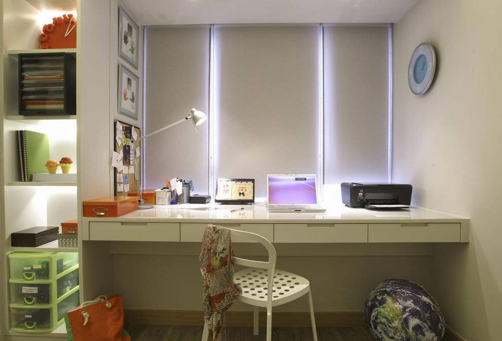 На окно лучше повесить короткие шторы, например, рулонные “день-ночь”, с помощью которых очень удобно регулировать степень освещенности рабочего места