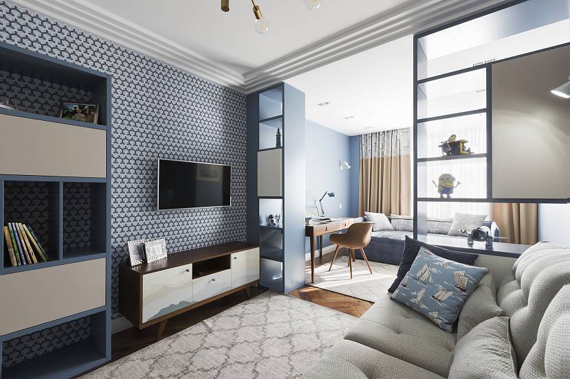 Для взрослого ребенка придется выделить большую часть пространства гостиной. В ней должна расположиться зона для сна, активных игр, занятий. Если правильно организовать пространство, на нем легко уместится все это. Главное, отказаться от покупки громоздкой мебели в пользу многофункциональных моделей.