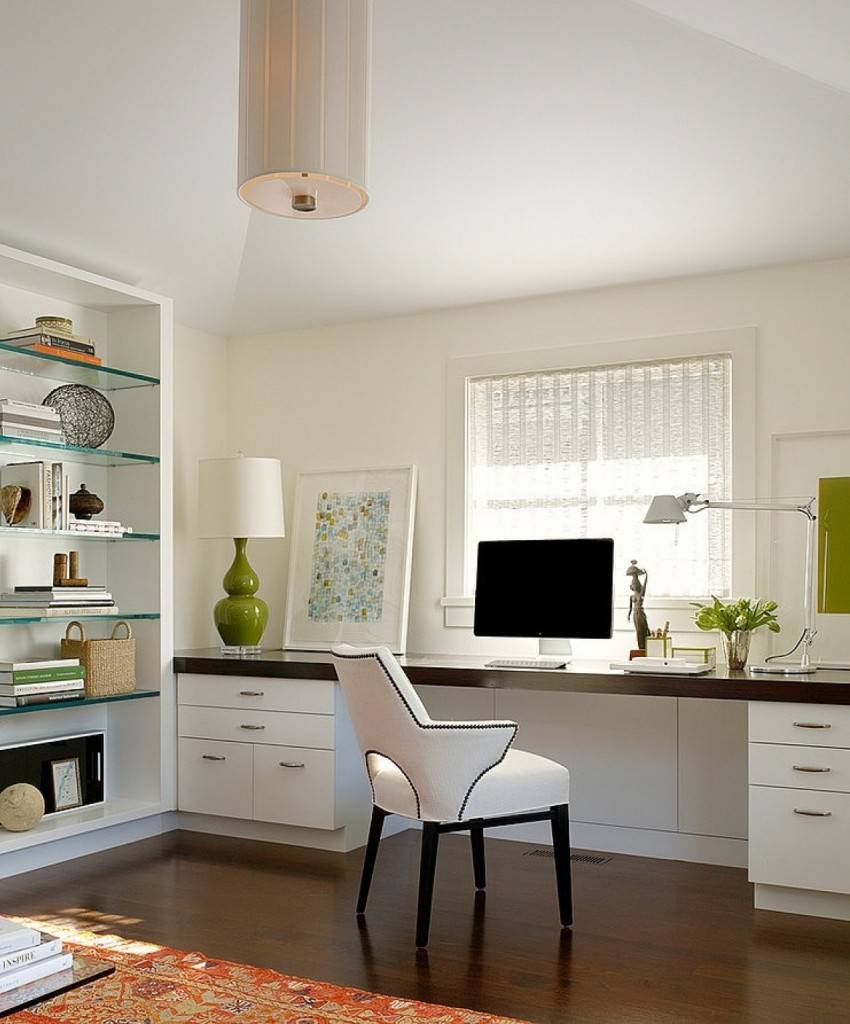 Подобные варианты обустройства рабочего места у окна следует продумывать до этапа монтажа подоконника. Такой стол под окном – стильное и удобное решение, особенно для небольших квартир. Экономия пространства, хорошая освещенность рабочего места и комфортная атмосфера – лишь неполный список среди всех его достоинств.