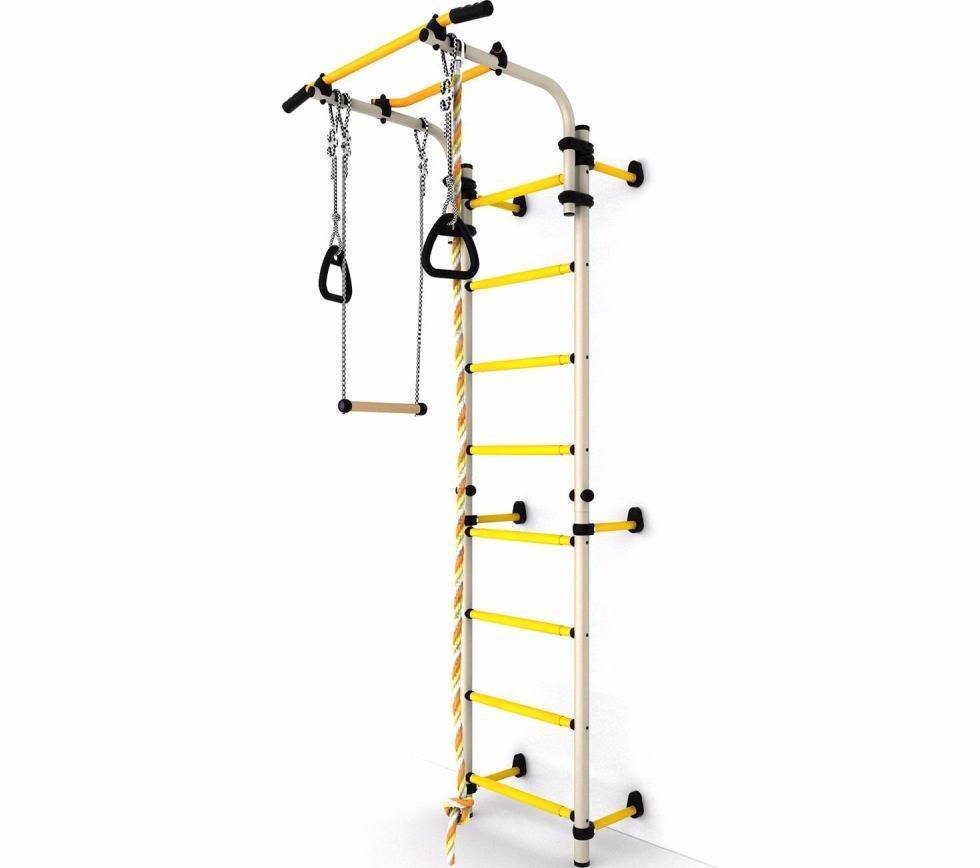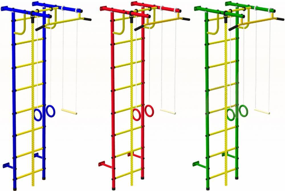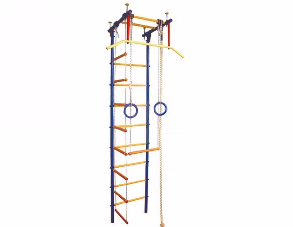 Это недорогой многофункциональный спортивный комплекс. Он оснащен канатным лазом шириной 80 см, кольцами, канатом и рукоходом. Метод крепления – пристенный. Модель представлена в двух вариантах расцветок.