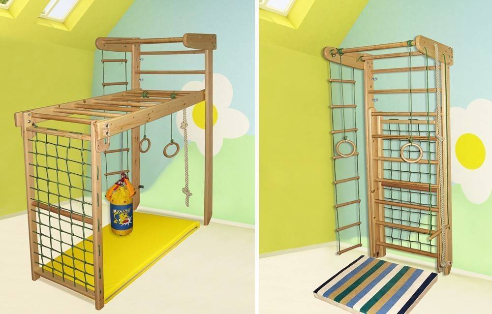 - Т-образный спорткомплекс — большие игровых возможностей с каждой стороны от шведской стенки