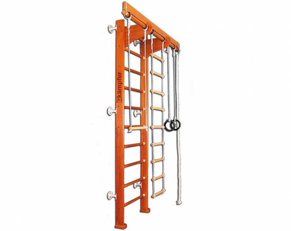 Эта шведская стенка нового поколения сочетает в себе функциональность и доступную цену. Комплекс оснащен сеткой для лазания, канатом, кольцами и баскетбольным щитом. Несмотря на кажущуюся громоздкость, модель довольно компактна. Ее длина составляет 1,2 метра. Метод крепления – пристенный. Модель представлена в двух вариантах расцветок. Вы можете выбрать яркую и «нарядную» конструкцию или более скромный вариант.