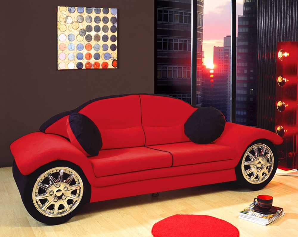Детские мини диваны отличаются интенсивностью цвета и нестандартностью формы. Так, нередки модели в виде фруктов, мультипликационных героев или транспортных средств. Также миниатюрные кушетки включаются в цельную конструкцию, для экономии места включающие в себя кровать на втором ярусе, диван, стол и шкаф – на первом «этаже».