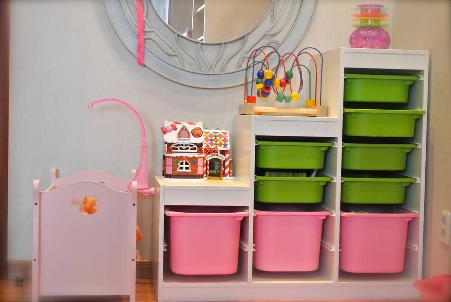 Это система стеллажей для хранения игрушек, предметов для творчества и любой мелочи, которая так важна ребёнку. Можно выбрать разные цветовые решения как самих стеллажей, так и контейнеров, а дополнить конструкцию подвесными полками и узкими шкафами-каркасами.