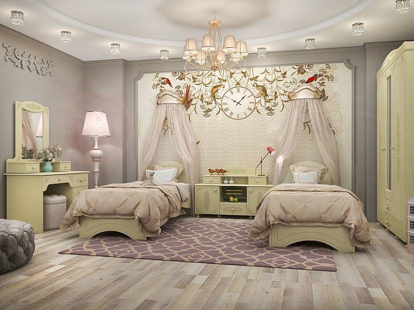 Классика. Классический дизайн помещения просто идеален для комнаты ребенка. Как правило, классический стиль включает в себя светлые, пастельные оттенки, натуральную деревянную мебель, наличие картин, красивых подсвечников и других декоративных штучек.