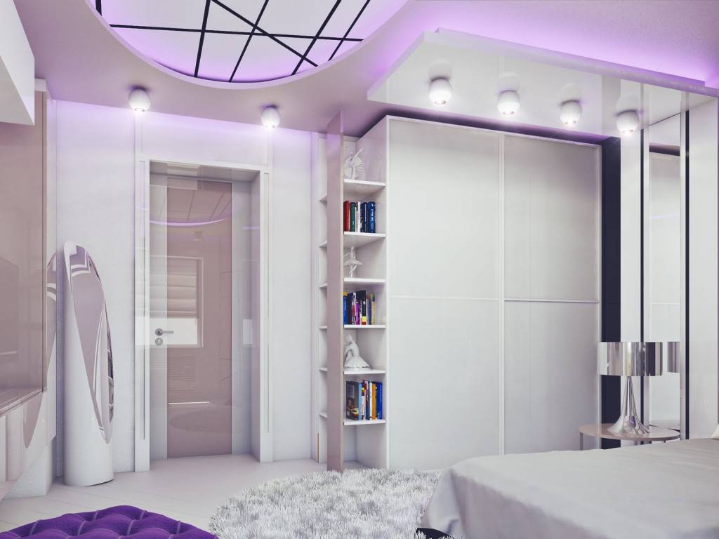 Для девочки школьного возраста подойдет стиль дизайна модерн с его асимметрией и пластичностью форм. Сдержанная цветовая гамма – для фона — и яркие акценты – настенные полки, большие плафоны светильников.