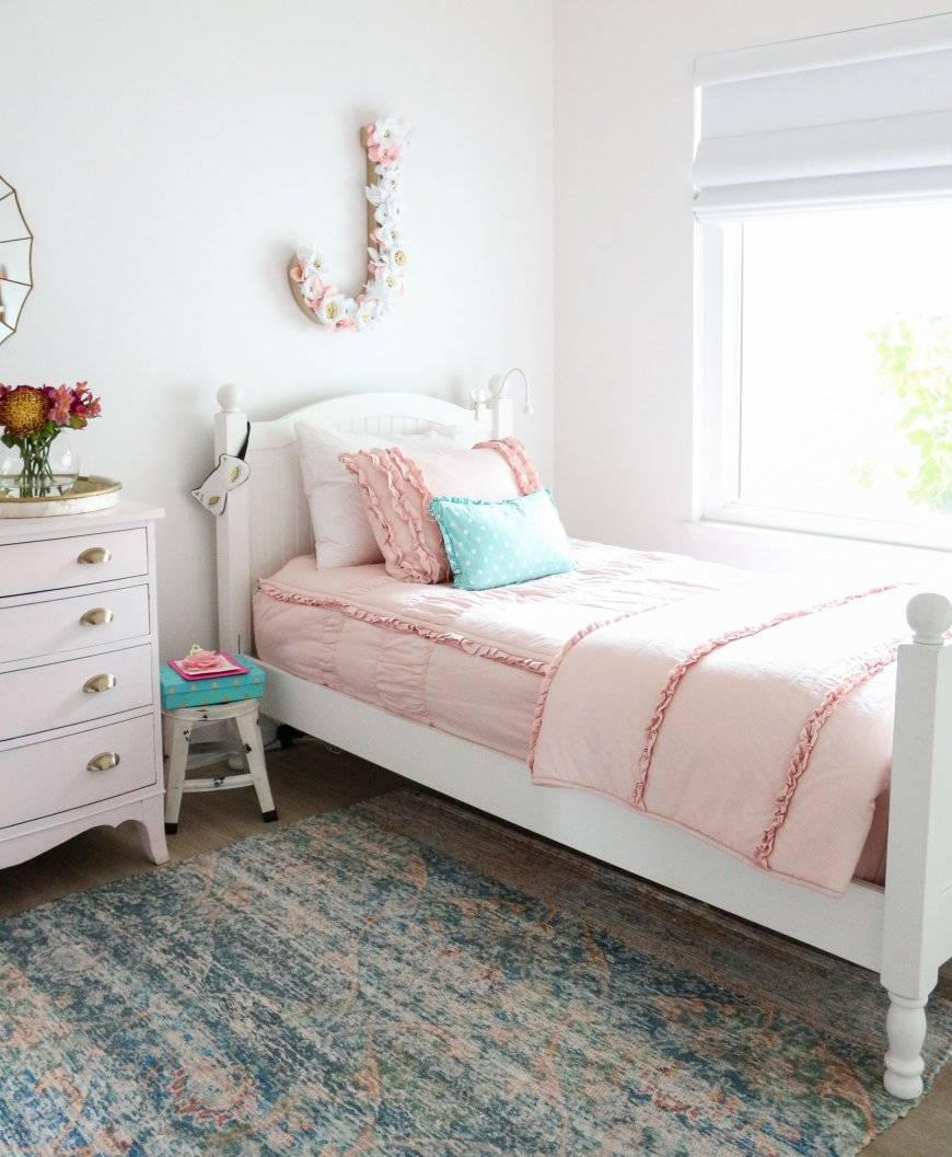 Подумайте о нескольких удобных и привлекательных предметов детской мебели для спальни. Современный коврик для пола, оконные шторки и дополнительное место в виде маленького диванчика – хорошие идеи для украшения спальни для девочки подростка.