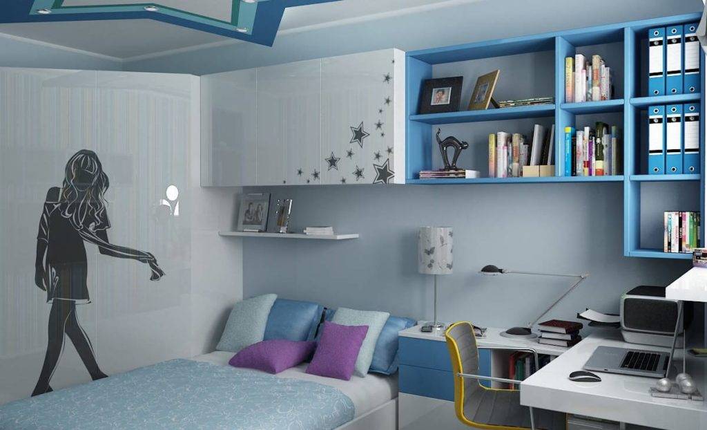 Чаще всего спальня девочки совмещена с ее рабочим кабинетом, поэтому нужно предусмотреть и зону со столом и книжным шкафом.
