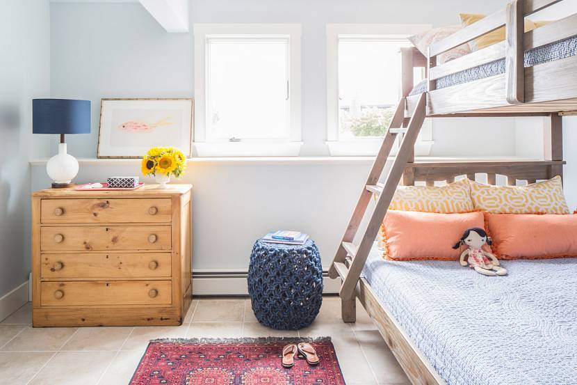 Зону сна и отдыха для ребенка обустраивают чаще всего кроватью с высокой спинкой. Приветствуются модели конструкций с выдвижными ящичками и декоративными полками. Практикуют организацию интерьера с помощью гарнитура разных оттенков: например, голубой отлично сочетается с оранжевым или красным. В детской спальне предпочтительнее использовать мебель ярких тонов с интересными веселыми орнаментами.
