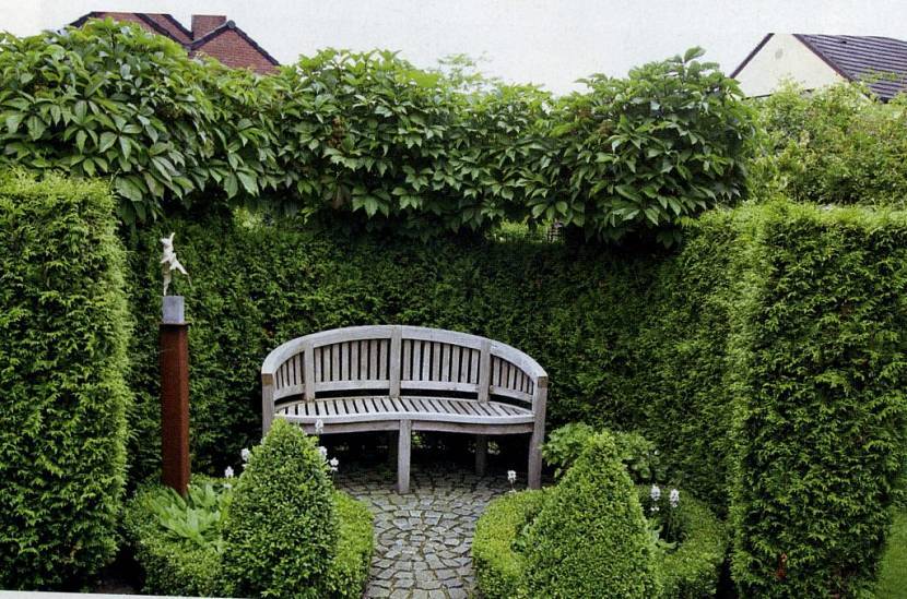 Садовые зеленые комнаты – не только атрибут ландшафтного дизайна, но еще и отличный способ зонировать площадку для отдыха на даче или у частного дома. Сюда подходят такие растения, которые используют для обустройства садовых топиариев (каркасных фигур, покрытых растительностью). Также будут уместны плетущиеся и лианоподобные виды растений. Такие «комнаты» изготавливают при помощи установки каркаса, по которому будут плестись растения, либо – живой изгороди и деревьев.