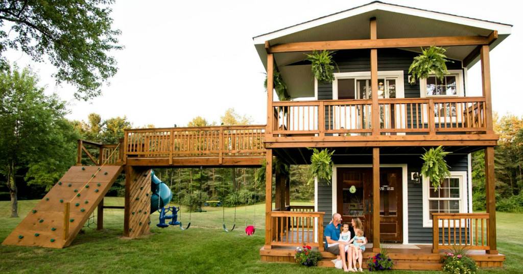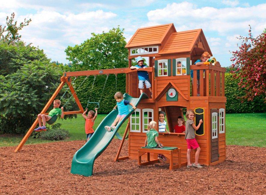 Конструкция может быть простой. Как вариант, можно обустроить двухэтажный дом для детей с горками и башнями.
