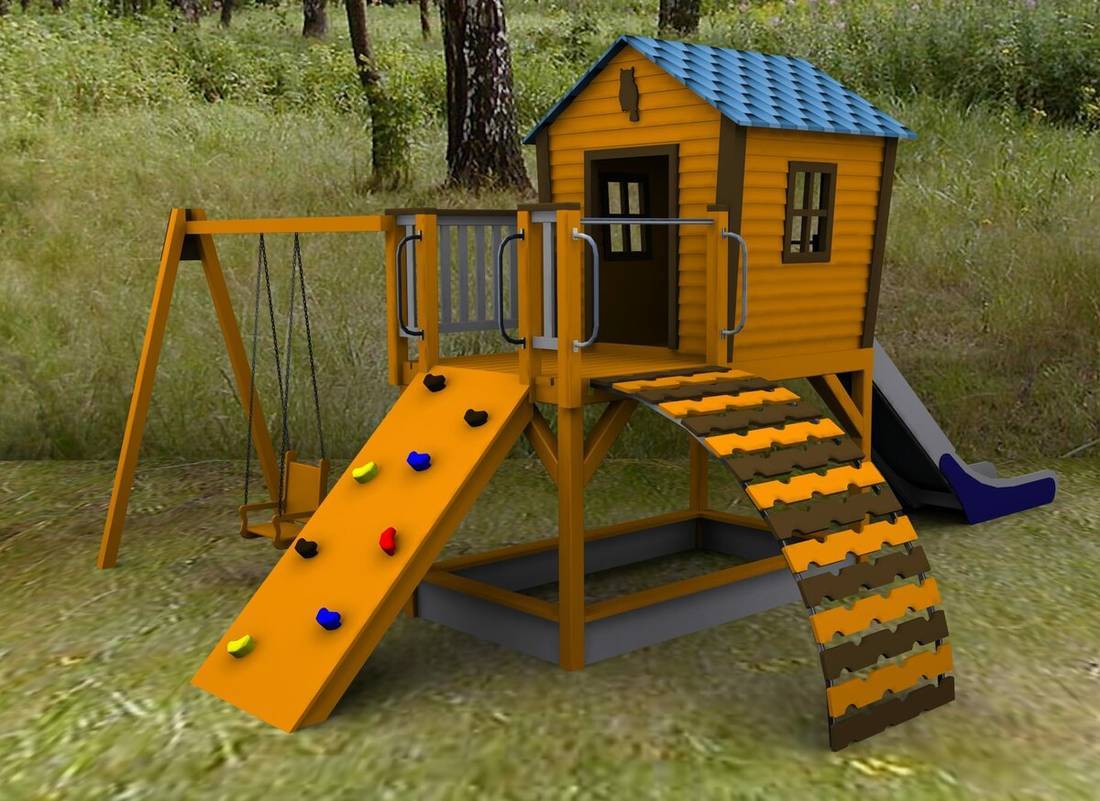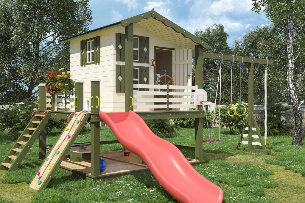 Часто конструкция домика дополняется лестницами или горками, превращая их в полноценные детские площадки для игр.