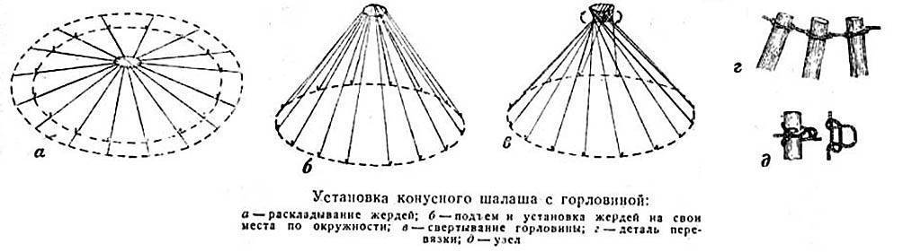 Вершина шалашного строительства –шалаш-вигвам или конусный шалаш с горловиной, в нем никогда не бывает душно. Способ установки показан на рис. ниже. Если нижние концы жердей поставить в траншею и засыпать вынутой землей, он простоит не один год. Таким же способом можно поставить и беседку для взрослых. Украсив ее со вкусом, увидим новый смысл в известном «В шалаше шурша шелками…».