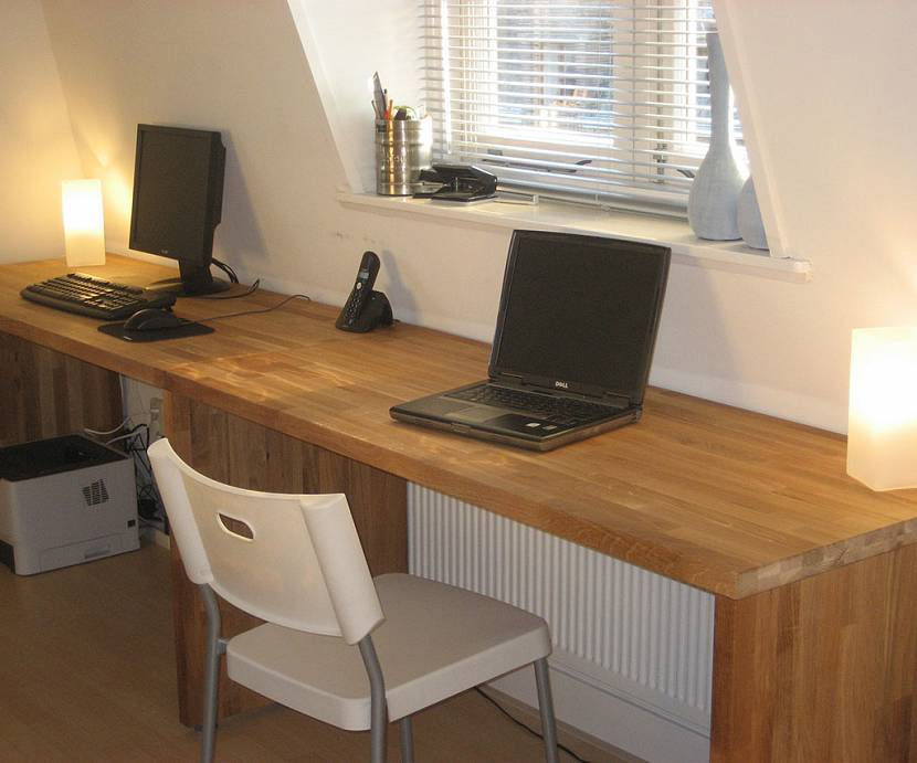 На фото пример интеграции подоконника в достаточно широкий письменный стол