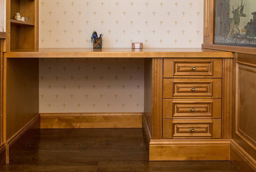 Встроенный письменный стол может идти от стены или иметь смешанную конструкцию: идти от окна и продолжаться вширь, занимая частично стену. Если в комнате живут два ребенка, это отличный вариант: так можно сделать большой стол, не занимая много пространства и значительно экономя его.
