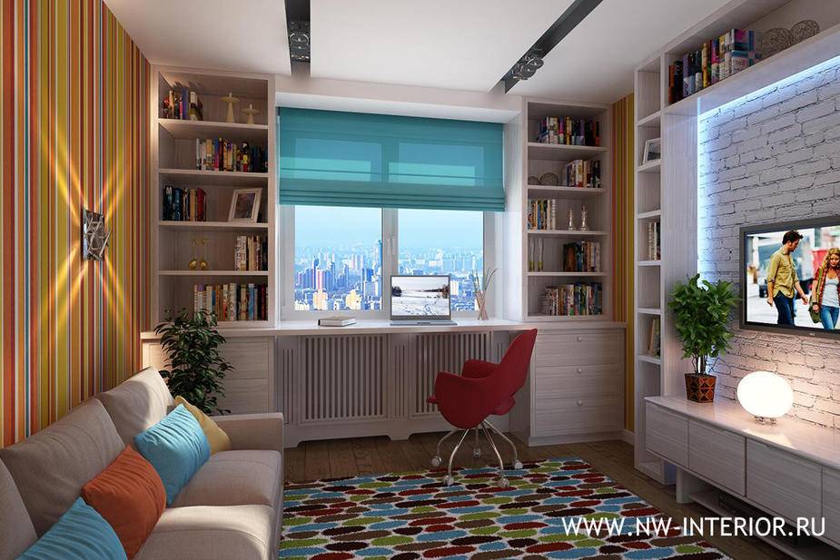 При желании подоконник можно расширить во всю стену и добавить под него тумбы, получив в итоге полноценный письменный стол