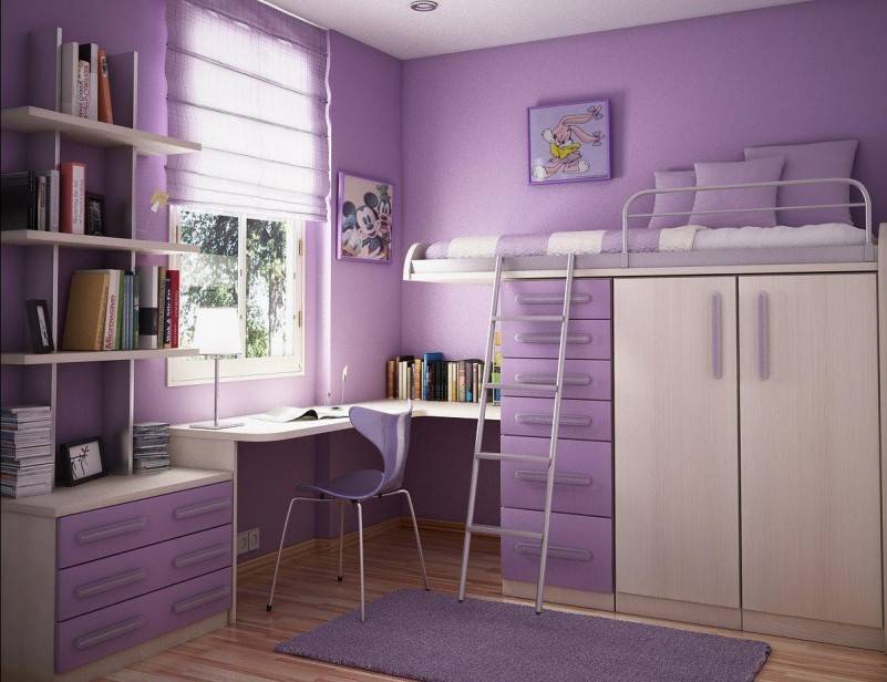 Для маленькой комнаты уместно совмещать и комбинировать мебель. Шкаф – отличный предмет, в который можно встроить письменный стол ребенка.