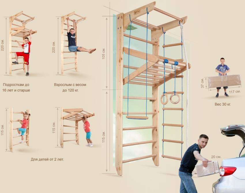 Для дошкольников шведская стенка комплектуется не так, как у взрослых. Это связано с тем, что дети еще не могут выполнять силовые упражнения, а в основном играют. Поэтому в комплектацию стенок для малышей входят основные детали: